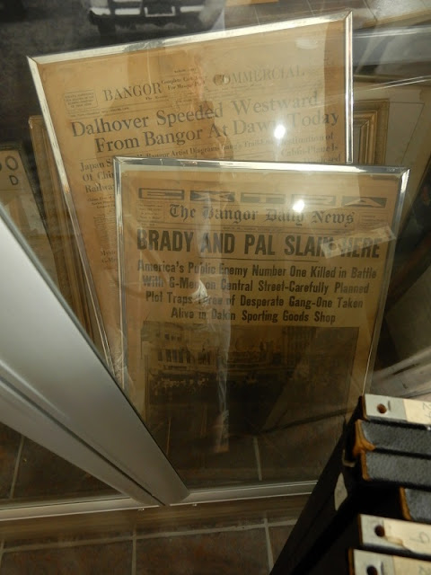 The displays presented a history of law enforcement, from old uniforms and call boxes, to weapons and restraints. I was fascinated by the front page headlines of the killing of the FBI's Public Enemy No. 1, Al Brady, in downtown Bangor in 1937.